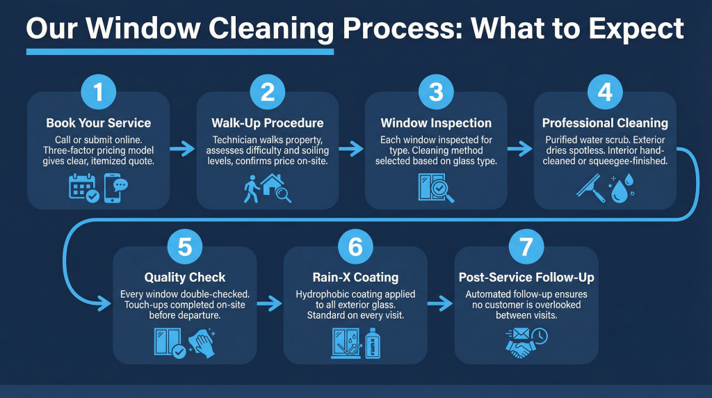 | Step 5 | Quality Check. Every window double-checked before the team leaves. Touch-ups completed on-site before departure. | Team does not leave until every pane passes inspection. |